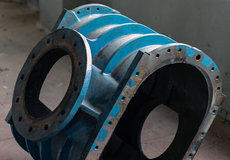 Industrial equipment blue hydraulic pump motor, blurred background. Coal industry