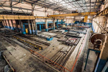 Interior of big industrial factory inside. Metalworking plant, heavy industry.