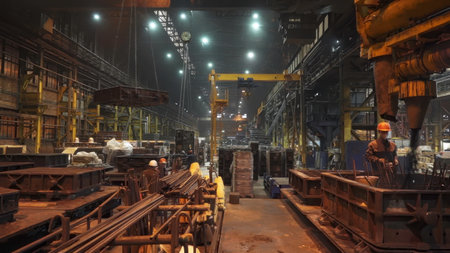 Industrial steel mill interior with large metal rolls on the ground. Concept of manufacturing, industry, factory, heavy machinery.