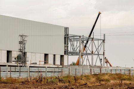 construction of a new complex at the plant. metal structures for the construction of the foundation. yellow crane carries heavy material through the air, metal structures in rust.