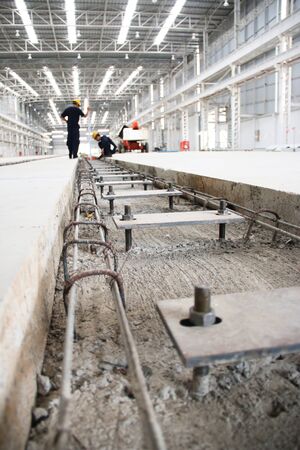 Belarus, Minsk region - March 03, 2020: Reinforcement mesh against the background of the production of concrete structures in a workshop at an industrial enterprise.