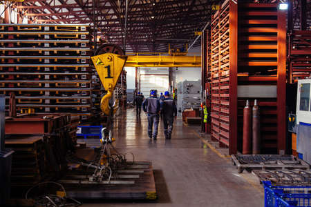 Industrial workshop or warehouse with steel goods and workers on metallurgical factory.