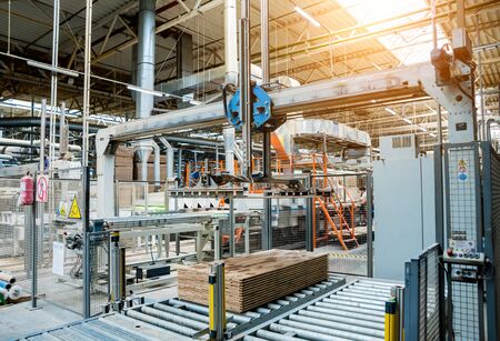 Production line of the wooden floor factory. CNC automatic woodworking machine. Industrial background