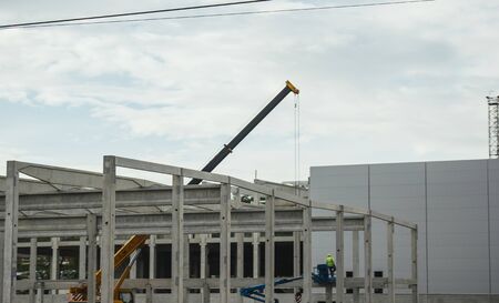 The construction site. Construction of the new building. Construction cranes.