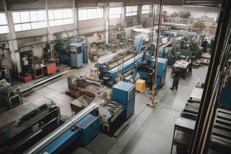 a busy factory floor with workers operating machinery and moving materials, created with generative ai