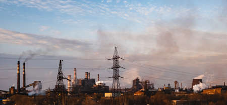 Chemical plant polluting air, smoke from chimneys. High power electricity poles