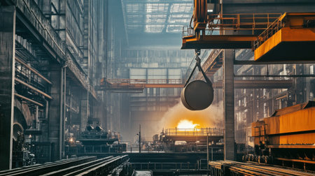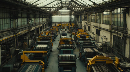 Explore the expansive interior of a steel mill with massive coils and machinery, illuminated by natural light streaming through the windows, capturing the essence of industrial production.