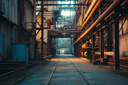 An industrial environment teeming with robust machinery and metallic infrastructure features. Concept Industrial Photography, Machinery Portraits, Metallic Structures, Robust Infrastructure