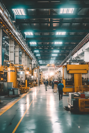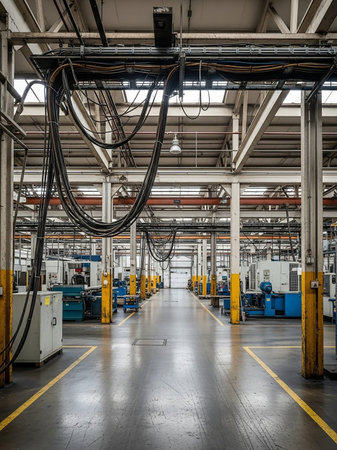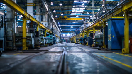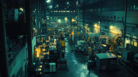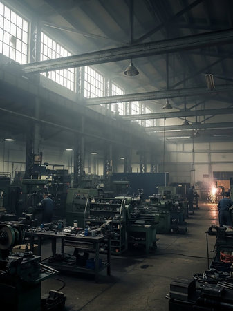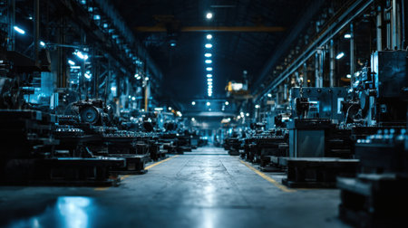 Explore the vastness of an industrial workshop filled with diverse machinery. The dim lighting and organized layout reflect the efficiency of manufacturing processes and technology.