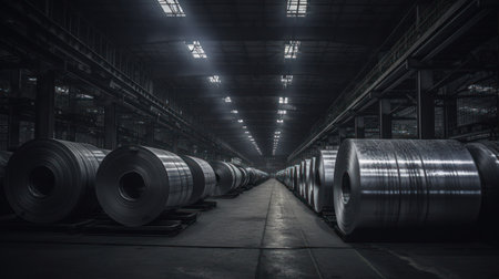 Rolls of metal lined up in a large factory warehouse. Generative AI.