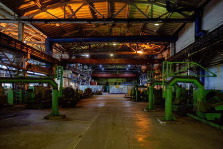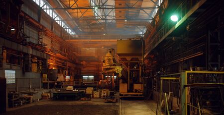 Interior of big industrial factory inside. Metalworking plant, heavy industry.