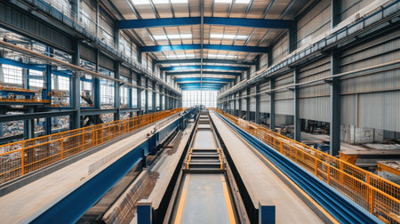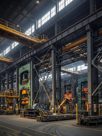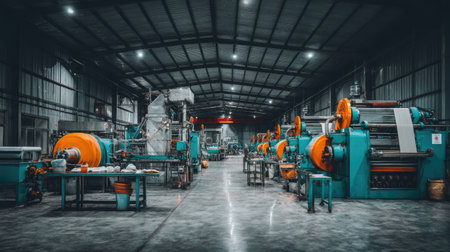Explore an industrial factory interior featuring advanced machinery and equipment designed for efficient manufacturing processes in a spacious environment.