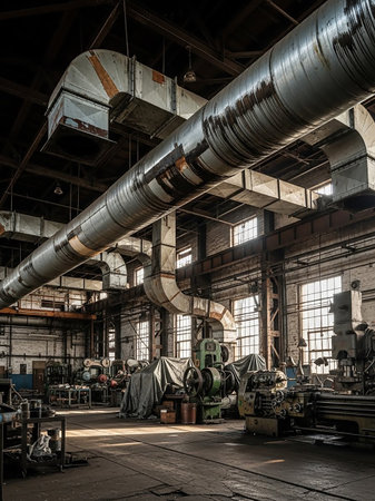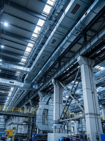 Manufacturing showing industrial warehouse interior with large ducts keywords: industrial, factory, warehouse, interior, machinery, pipes, ducts, ventilation, metal, steel, grunge,...
