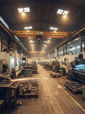 The interior of an industrial factory with rows of machinery, where sparks fly from metalworking processes, highlighting manufacturing and production.