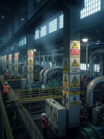 An industrial power plant interior filled with large turbines, extensive piping, and numerous safety warning signs, with workers present.