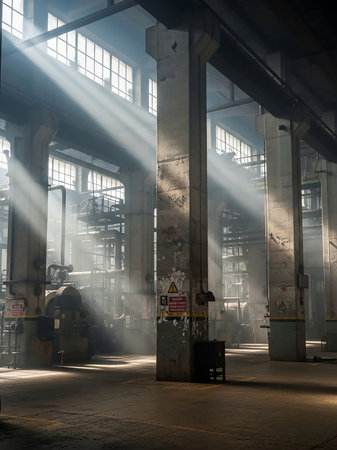 Sunlight streams into a cavernous industrial factory, illuminating massive steel beams, intricate pipework, and large machinery.