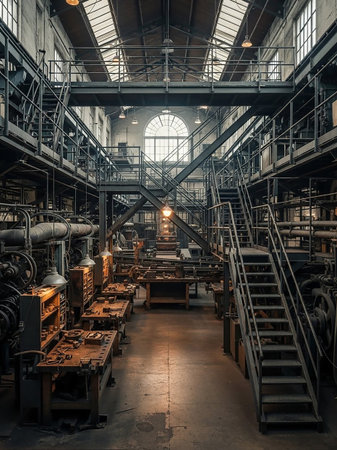 A captivating view of an expansive industrial workshop filled with vintage machines and tools, highlighting the rich craftsmanship and historical ambiance.