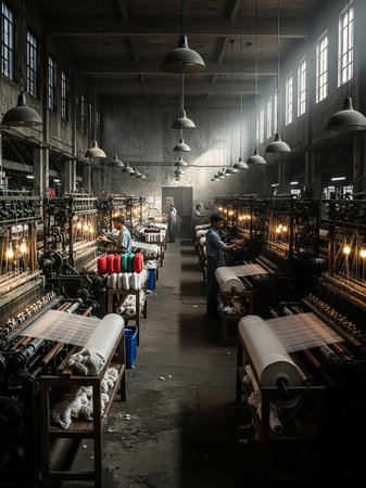 A dimly lit vintage textile factory interior with rows of operational looms, workers tending to them, and spools of colorful thread on display.