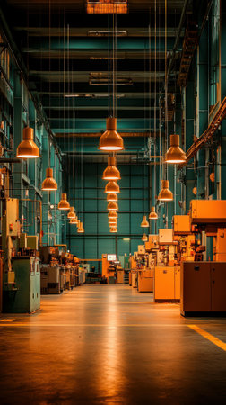 Spacious industrial warehouse interior with warm pendant lights illuminating machinery and workstations in a modern environment.