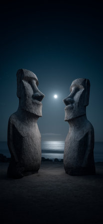 Ancient Moai statues standing by the ocean under a night sky with bright moonlight. Moai statues on Easter Island watching rising moonlight