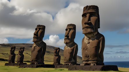 Ancient moai statues under cloudy sky on Easter Island, Chile