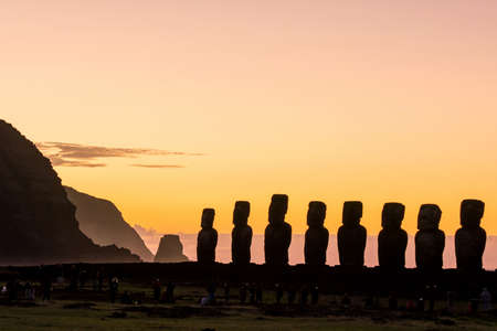 Sunrise at Ahu Tongariki in Easter Island. 15 moais shilouette and clouds