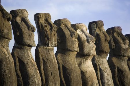 Photograph of the 15 moais at Ahu Tongariki on Easter Island in Chile.