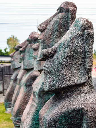 RATCHABURI, THAILAND-MAY 12, 2019 : Beautiful Moai imitation of the real statue simulates a roadside coffee shop symbol (Moai theme cafe) at Moai coffee shop, Suan Phueng, Ratchaburi.