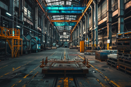 An interior perspective reveals a vast industrial hall filled with machinery and overhead cranes. The image showcases a metallic structure bathed in ambient light, with a focus on lines and symmetry. Suitable for commercial applications, the scene displays a functional environment, potentially used in manufacturing or heavy industry operations.