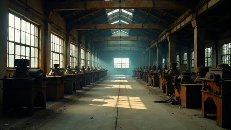 Dusty rays of light filter through shattered windows of an abandoned factory, illuminating rows of rusted machinery. Shadows stretch across the worn floor, echoing silence and history.