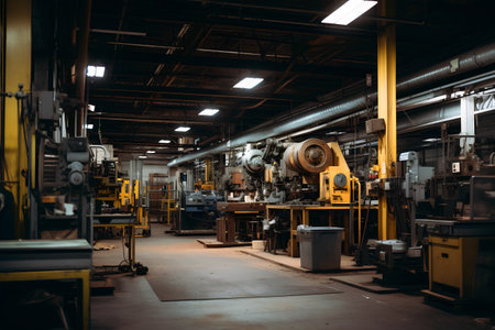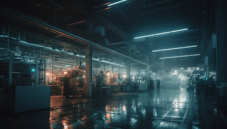 Inside the futuristic metal industry factory, machinery illuminates the workshop generated by artificial intelligence
