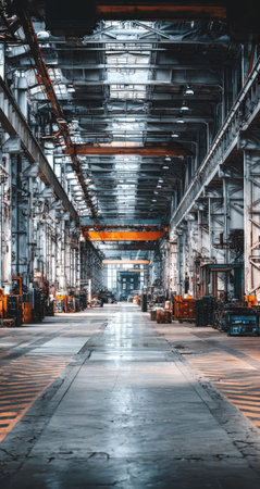 Factory Machinery Industrial Hall Interior Long perspective view of a vast factory floor with heavy machinery and overhead cranes in a dimly lit industrial building
