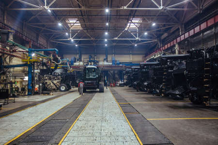 Production line of assembling agricultural tractors and harvesters.