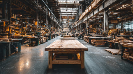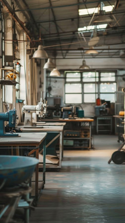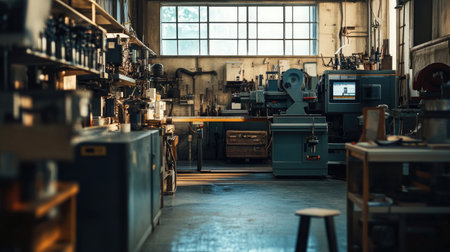 A vibrant industrial workshop interior featuring various tools and machines designed for craftsmen and artisans. This well-lit space showcases creativity and craftsmanship, perfect for projects ranging from woodworking to metalworking. Ideal for professionals seeking inspiration or resources.