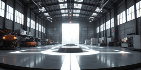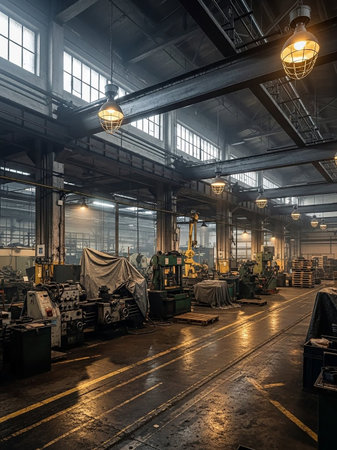 A spacious industrial warehouse interior featuring machinery and tracks under bright ceiling lights highlights the manufacturing environment.