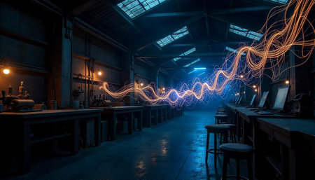 Industrial laboratory interior with energy trails and glowing lights