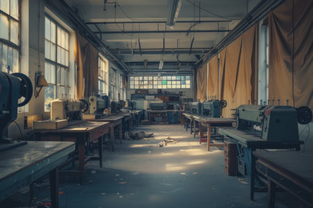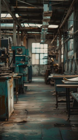This image captures an abandoned factory workshop featuring vintage machinery illuminated by natural light. The space conveys a sense of quiet nostalgia and industrial charm.