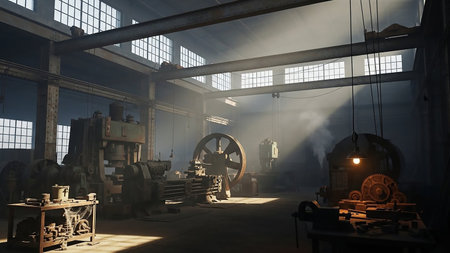 An old industrial workshop filled with heavy machinery, metal parts, and shafts of sunlight streaming through the windows.