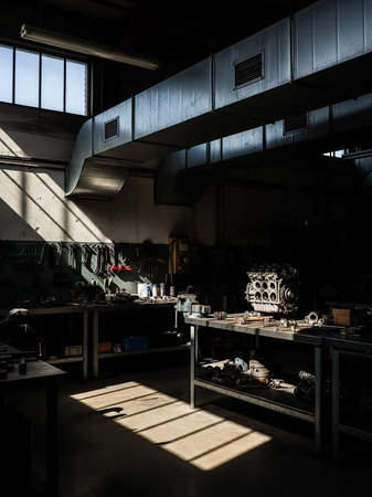 A dimly lit workshop interior shows tools and engine parts on workbenches, with dramatic sunlight streaming through a window.