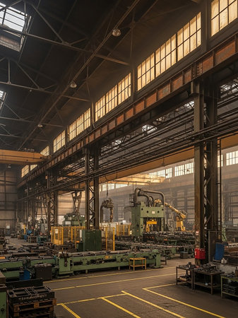 The interior of an industrial factory is filled with machinery, overhead cranes, and large windows that allow natural light to illuminate the vast production space.