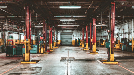 A spacious industrial workshop interior showcasing multiple lift equipment, designed for mechanics and technicians working in a clean and organized facility.