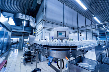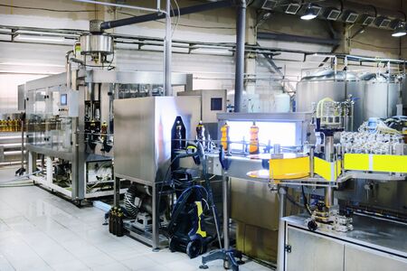 Beverage factory interior. Conveyor with bottles for juice or water. Modern equipments