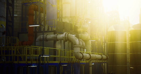 During the evening, an industrial facility showcases a network of pipes and large tanks. Warm light enhances the structures complexity and adds depth to the setting.