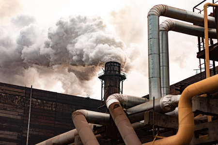 Industrial factory smokestack emission carbon gases and in atmosphere. Industry zone, factory smoke plumes. Climate change, ecology and global warming