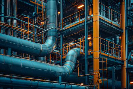 A captivating view of industrial pipes and machinery in a dimly lit factory, showcasing a stunning interplay of blue and orange lighting, highlighting the intricate details of the structure.