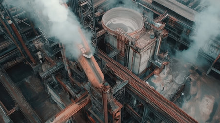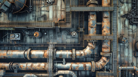 High above an industrial landscape, complex machines and rusted pipes intertwine, revealing the intricate details of factory construction and materials.