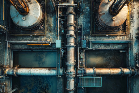 Top view of a complex water supply system featuring metal pipes and electrical equipment, showcasing sleek design and modern industry at work.