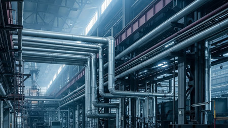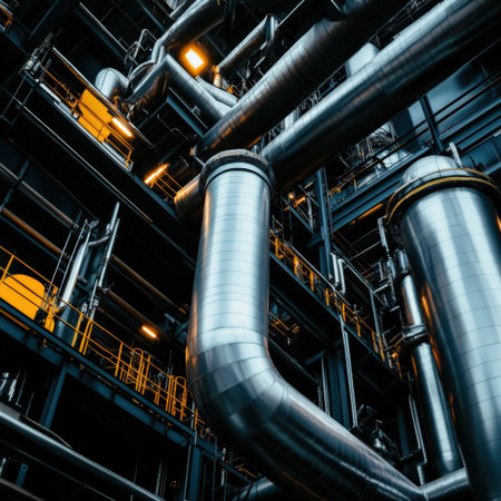 Industrial Powerhouse Complex Piping System, Polished Metal Structures, and Modern Engineering