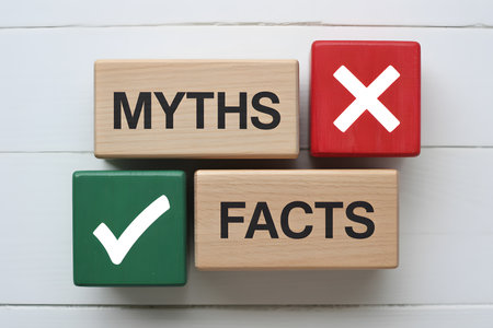 Flat lay of wooden blocks labeled 'MYTHS', 'FACTS', with red 'X' and green checkmark symbols on a light wooden background, showcasing clarity and minimalist design.