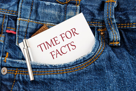 Time for facts message written on a business card peeking out of a jeans pocket